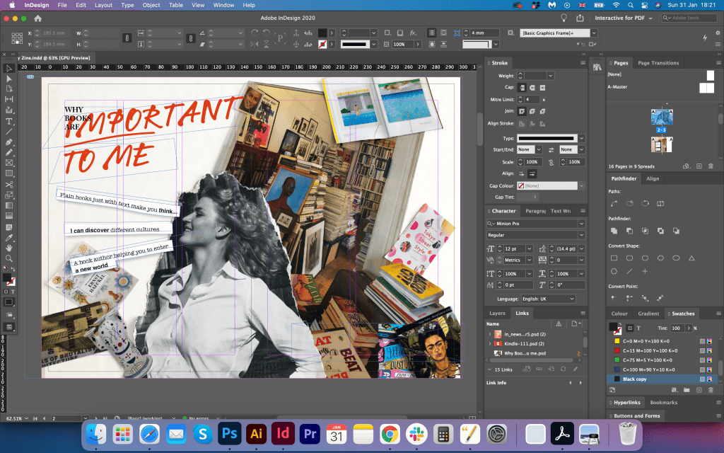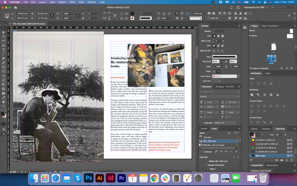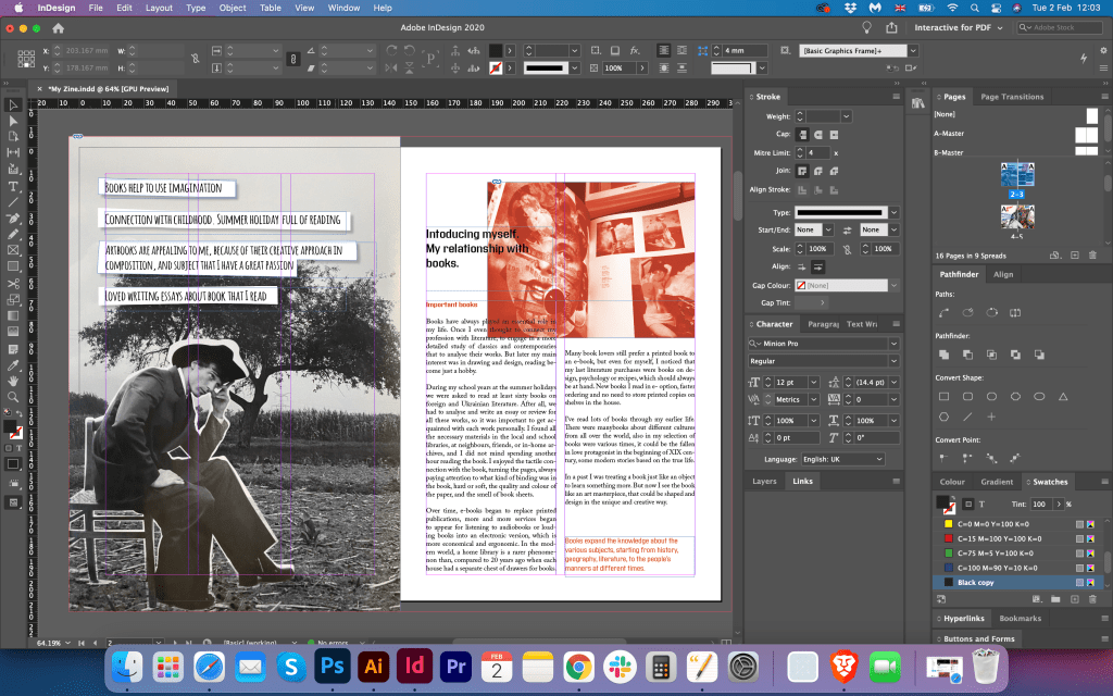 Later my thinking path brought me to the idea of creating the page Introducing Myself. I wrote an essay about my relationship with books, how it all began, and where my passion for the book is coming from. That was quite exciting processes for me to write, as I remembered myself in earlier life, and I’m glad I could tie together my experience in graphic design and my enthusiasm for the reading and books. I found the image of the tree in the magazine, and I wanted to place on the top of it the person ‘thinker’, in the cut and paste manner. That image symbolises me in the thinking process. I tried to put some of the mind maps on the top of the image, but they looked slightly messy, so I decided to place some phrases on it, a similar way I used for the “Why books are important to me” page, but with different decorative font Amatic Bold. I tested a few options with a black and white version for the images. For the right page, I used the picture from my collage book with some red effect on the top of it.
