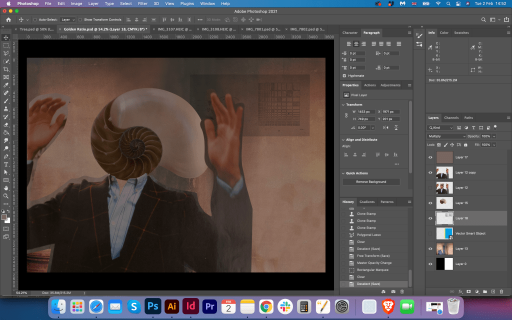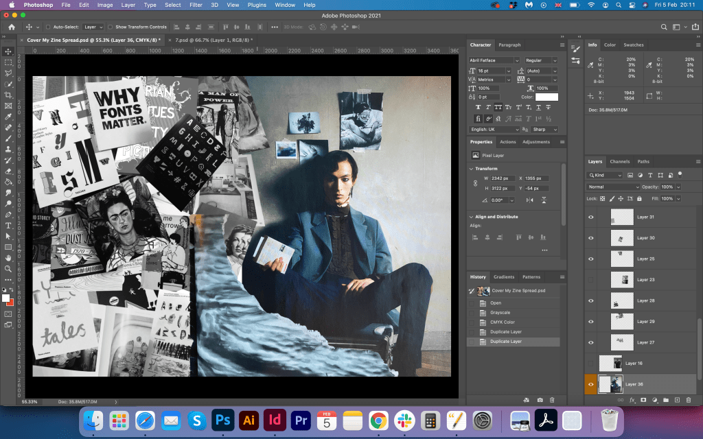 After writing the article I needed to place the wording into the booklet. I was going to use a white background for it with a template I used for the Future of the Book page, as I had some text to make it look like for the magazine spread. I placed the image of the shell, which is the symbol of the golden ratio, also I wanted to place some square images around the layout. But I thought that that page need still to have a feel of collage design, I wanted to bring that juxtaposition mood into it. That’s where the idea with a book headed boy came from. In Adobe Photoshop I made some manipulations with the image, by swapping guys with the shell image, the idea of juxtaposition is seen in that design with some vintage like the background in it. Later I had a little issue with text visibility, so I needed to make sure that the image is contrasting enough for the white or black fonts. I made the page darker and used same grid which I had in my page template. To bring the dynamic into the page I used some phrases about the Fibonacci series and the golden ratio around the shell-head.