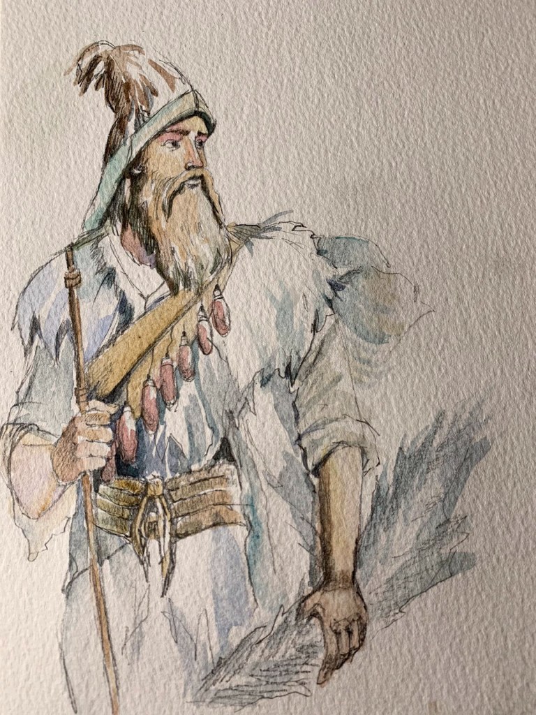 The next stage for me was to design a cover with a painting of Robinson Crusoe. I had an idea to picturise the image of the protagonist, with a self-proud. I found some different portraits of Robinson, some of them showed the tired man, all wrapped in clothes, looking tired and lonely, and some of the images showed a happy man, who looked like he loved his life on the island, but this image showed just proud man, quite calm. He looked a bit like the owner of the space and the land, maybe a bit too unrealistic, but I loved the spirit that that painting could bring. I started with a sketch, adding some colours to it. For the background of that portrait, I added just slight transparent colours with blue (water) and green (land). I was going to use it for the deluxe book cover, and for the pocketbook as well.