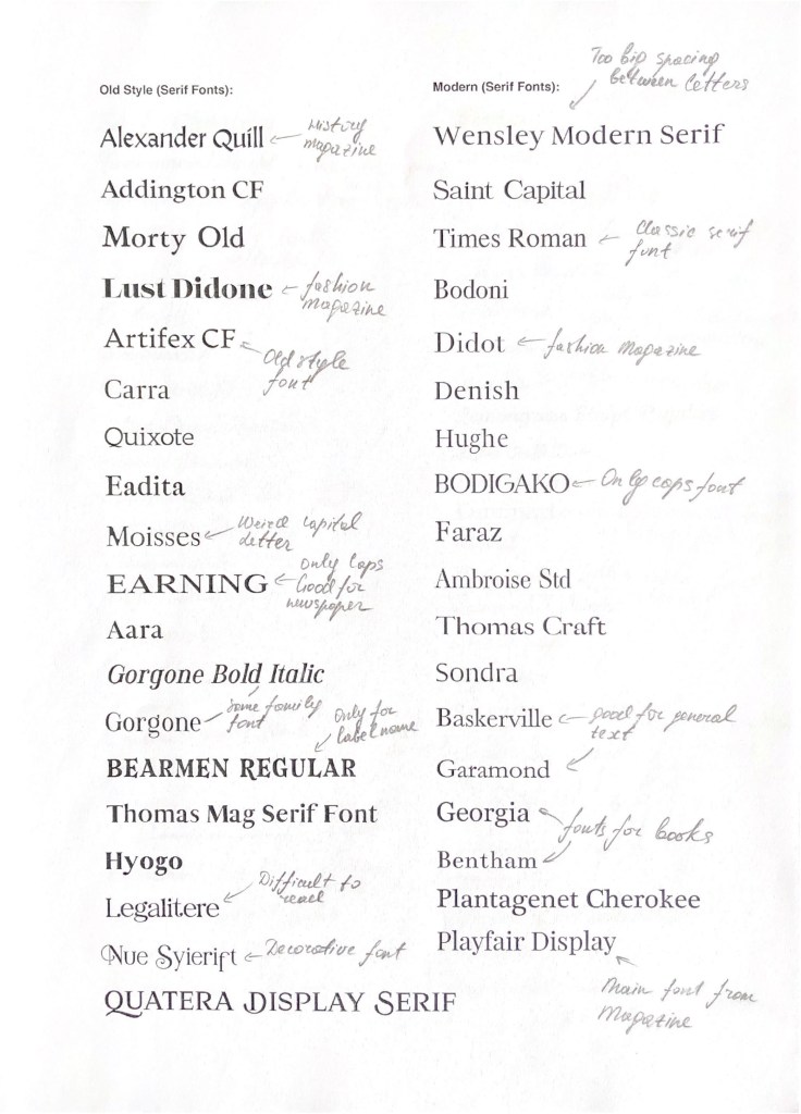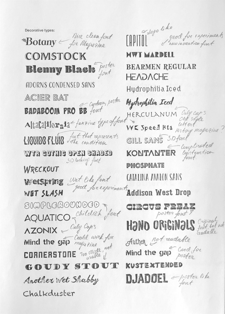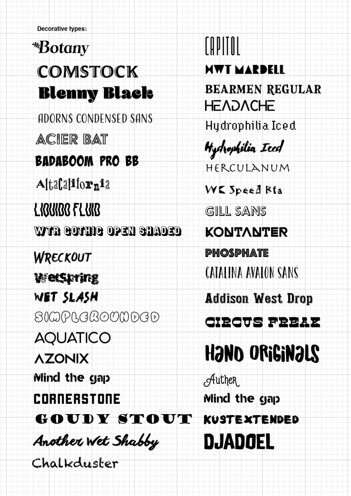 I printed the set of typography and placed them in the order. I tried to classified them into the groups, but also analysed what area could be appropriate for some of them.