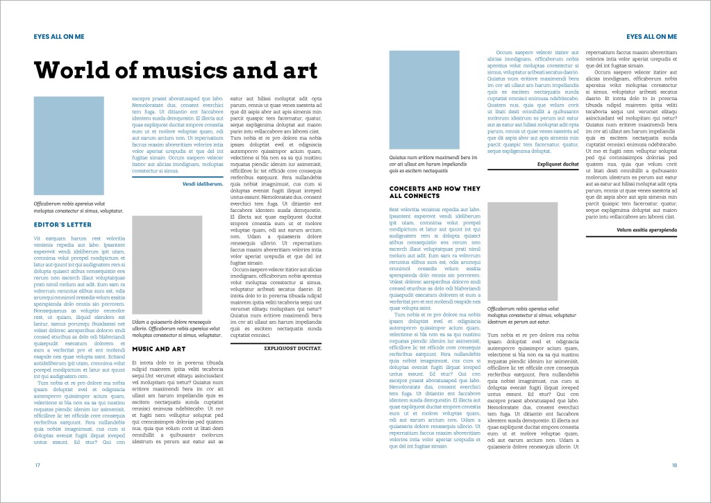 For the last version I tried completely different fonts combination. I used script Bickham Script Pro for the header. The header font looked fine, it didn’t look tike the type I would see every day for the magazines, but it could be acceptable font for the classic music publication. Sansumi-DemiBold serif font for intro, Tonic Bold main body, MartinGotURWTMed subhead, not something I would use, as the shape of the fonts conflicting and don’t work together. I can see that types mismatch in this template, so it’s still good to be considerable, when choosing appropriate typography for a magazine, a science book or newspaper.