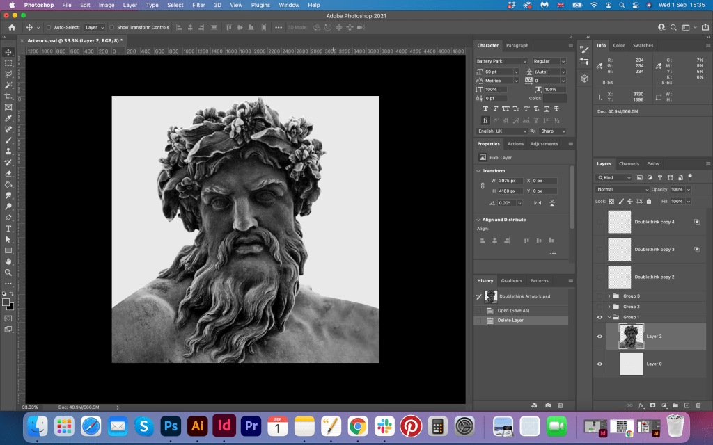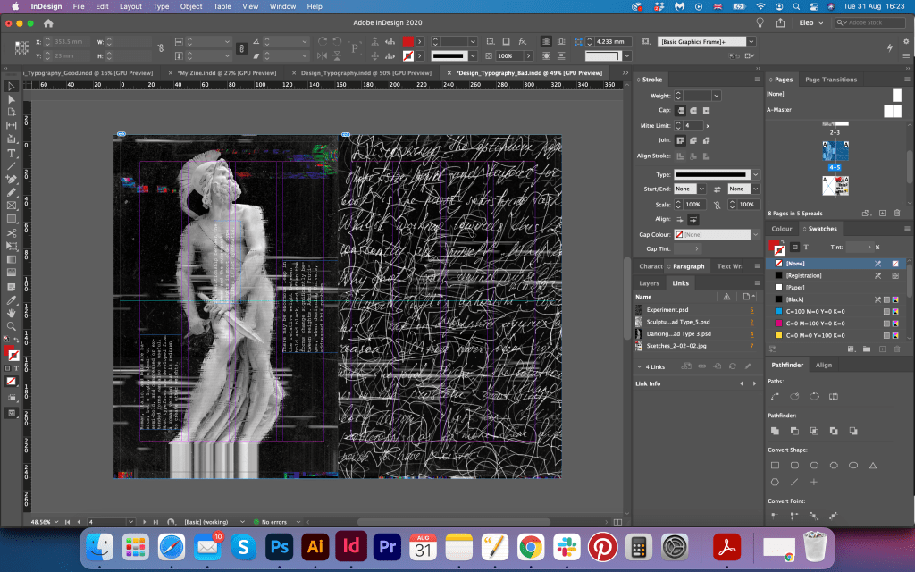I started the book design with an inspiring image of the Statue of Zeus at Olympia. I wanted to bring some distortion on it, that to apply the glitchy font with it, that in summary would bring similar result as I had in Experimental Typography exercise. The placement of the type I left for later. I realised that the image of the sculpture dominating here, and that is a very powerful and popular piece of art, but I wanted to highlight it with the necessary brief, which is bad typography.