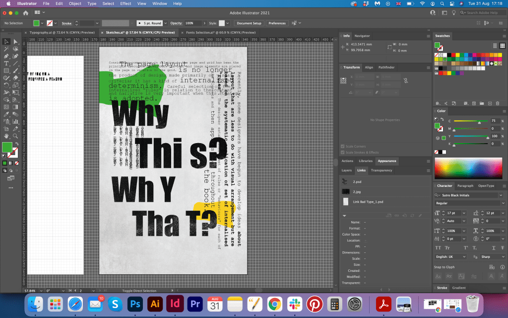 For the last spread I had inspiration from the David Carsons, Paul Dutton, Walasse Ting works. Here I have dominating big font Impact, with wrong spacing in it, saying Why this, Why that? with some text around it. I purposefully made some spacing wrong, the distance between the sentences. On the left side, I had the text looked like made by typewriter, all squashed as well, using font Fira Mono. I think those pages were good additions to each other and created good looking bad typography spread.