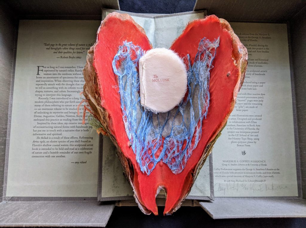Some of those artists books bring a special meaning, like the example below is symbolising reminder to conserve and respect the earth. Large enough to be cradled in both hands, The Mollusk has wispy pages in bright red, blue and purple that make up the animal’s filtering gills. In the centre, there is a small white letterpress book, like a pearl, bound with string, that reads a small poem. According to the artist, the piece is