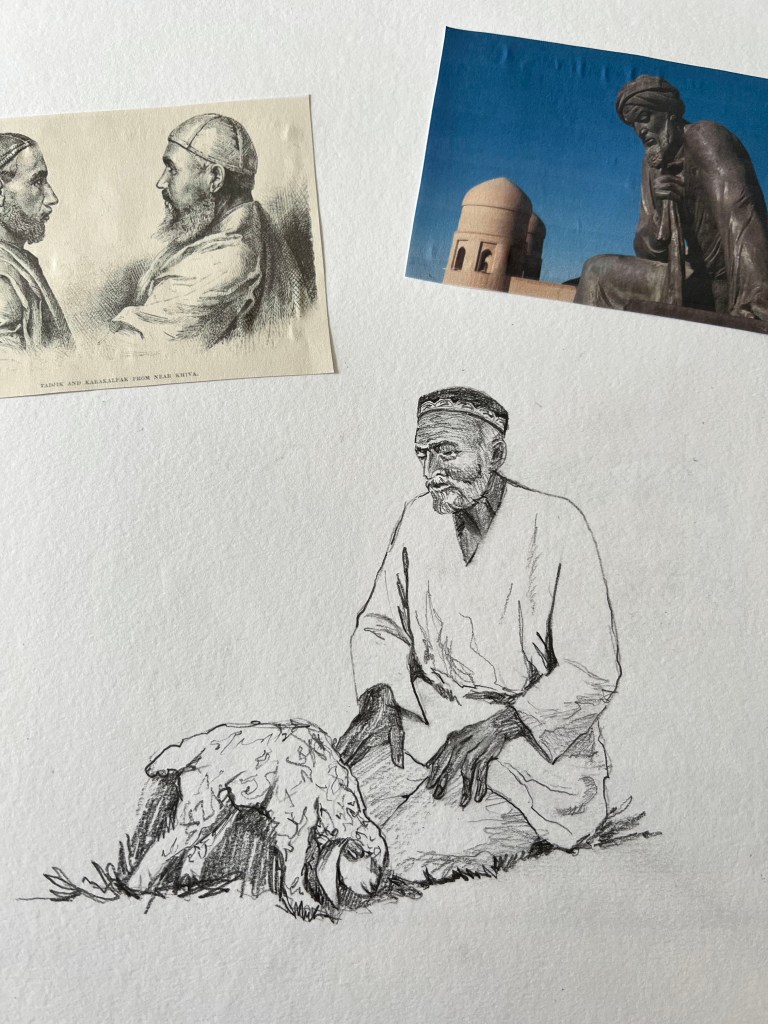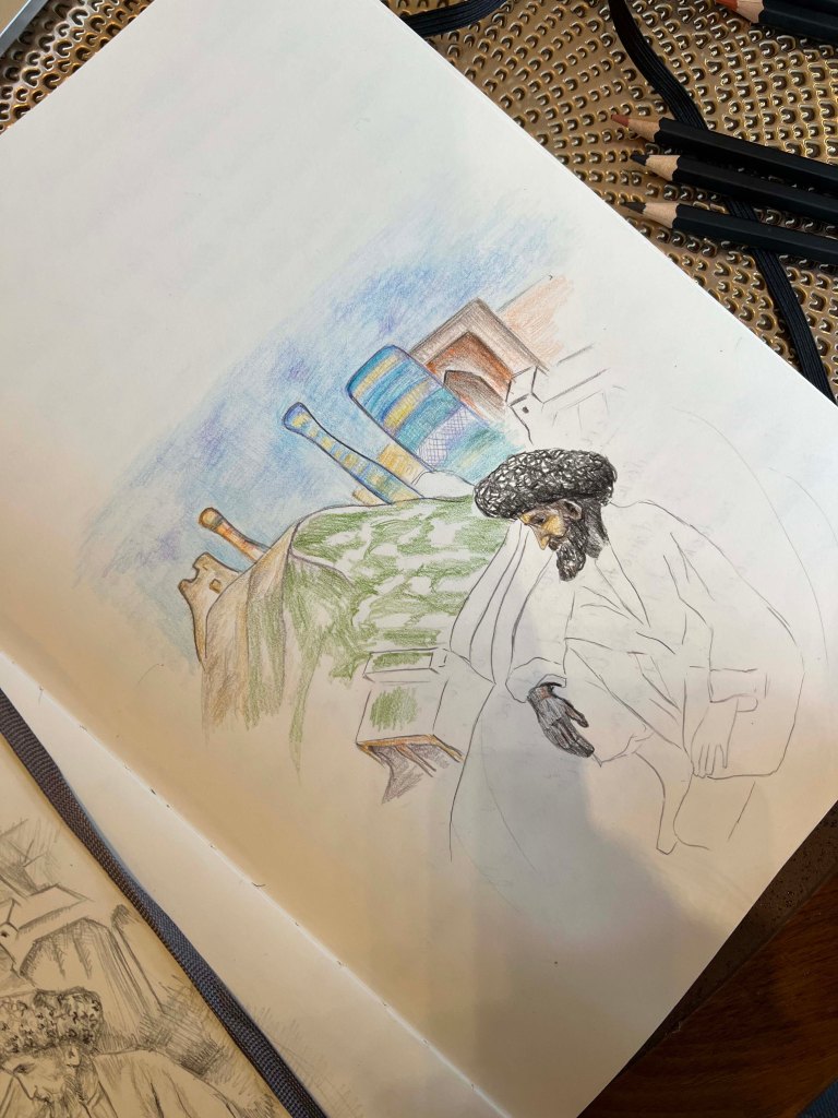 I was thinking about traditional mosques in Uzbekistan. During my research, I found there is one quite authentic Juma Mosque a 10th-18th century mosque in Khiva, Uzbekistan. Buildings could be challenging to sketch from the architectural point of view, so I decided to concentrate on sketching people in a traditional environment.