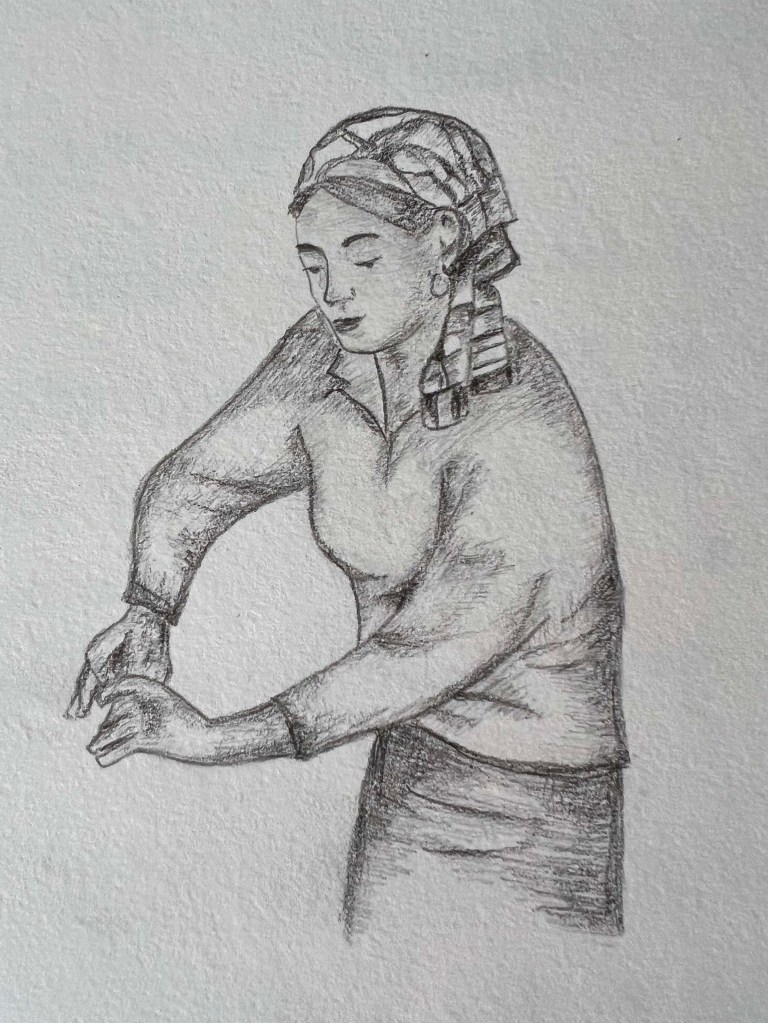 I made the same sketch but with watercoloured pencils drawing. I was worried as it could look a bit flat with coloured pencils, but surprisingly the image turned out to be quite authentic and similar to the artists’ illustrations I was inspired by.