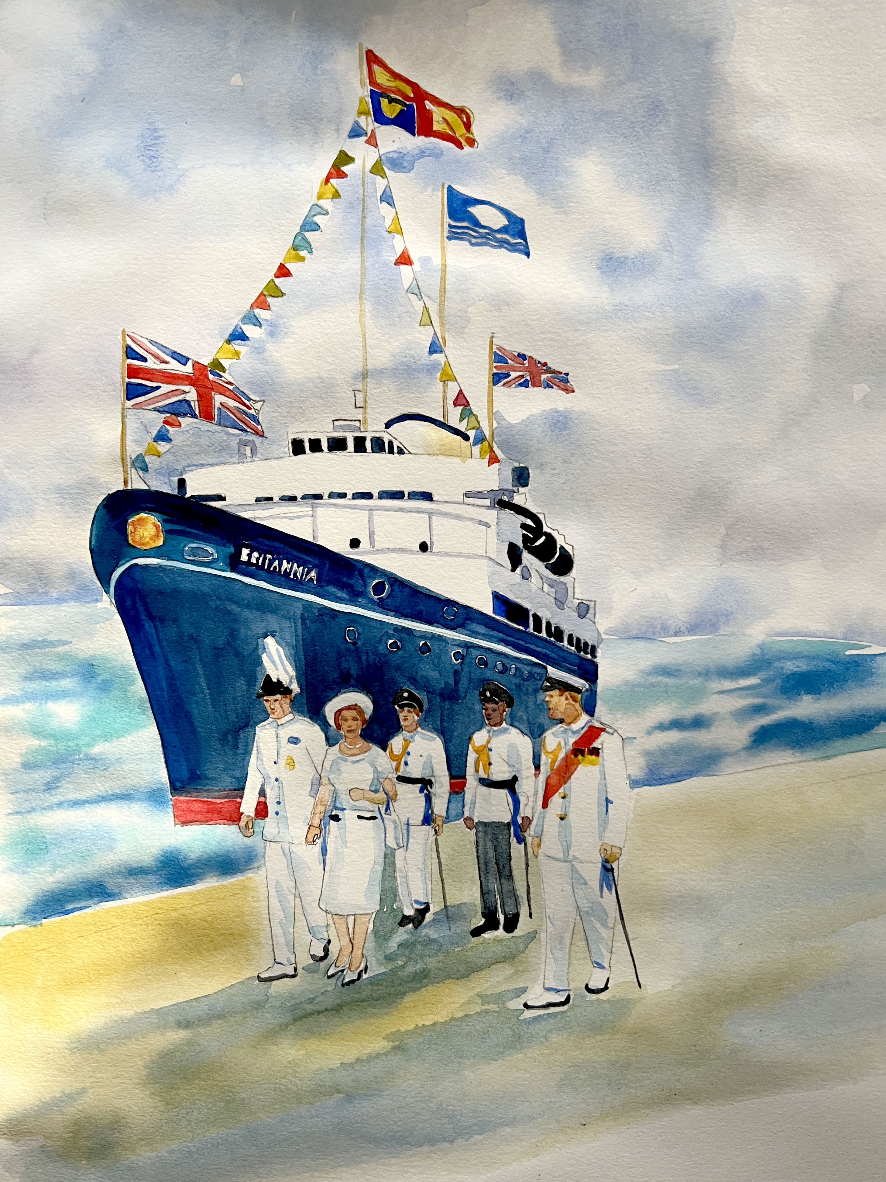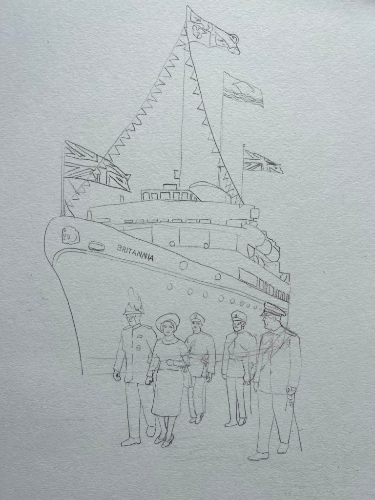 When I read this article, I imagined a prominent and prestigious Royal Yacht Britannia, surrounded by crowds of people, that are happy to meet their Queen. I thought that would be a great illustration to match the theme of the magazine article.