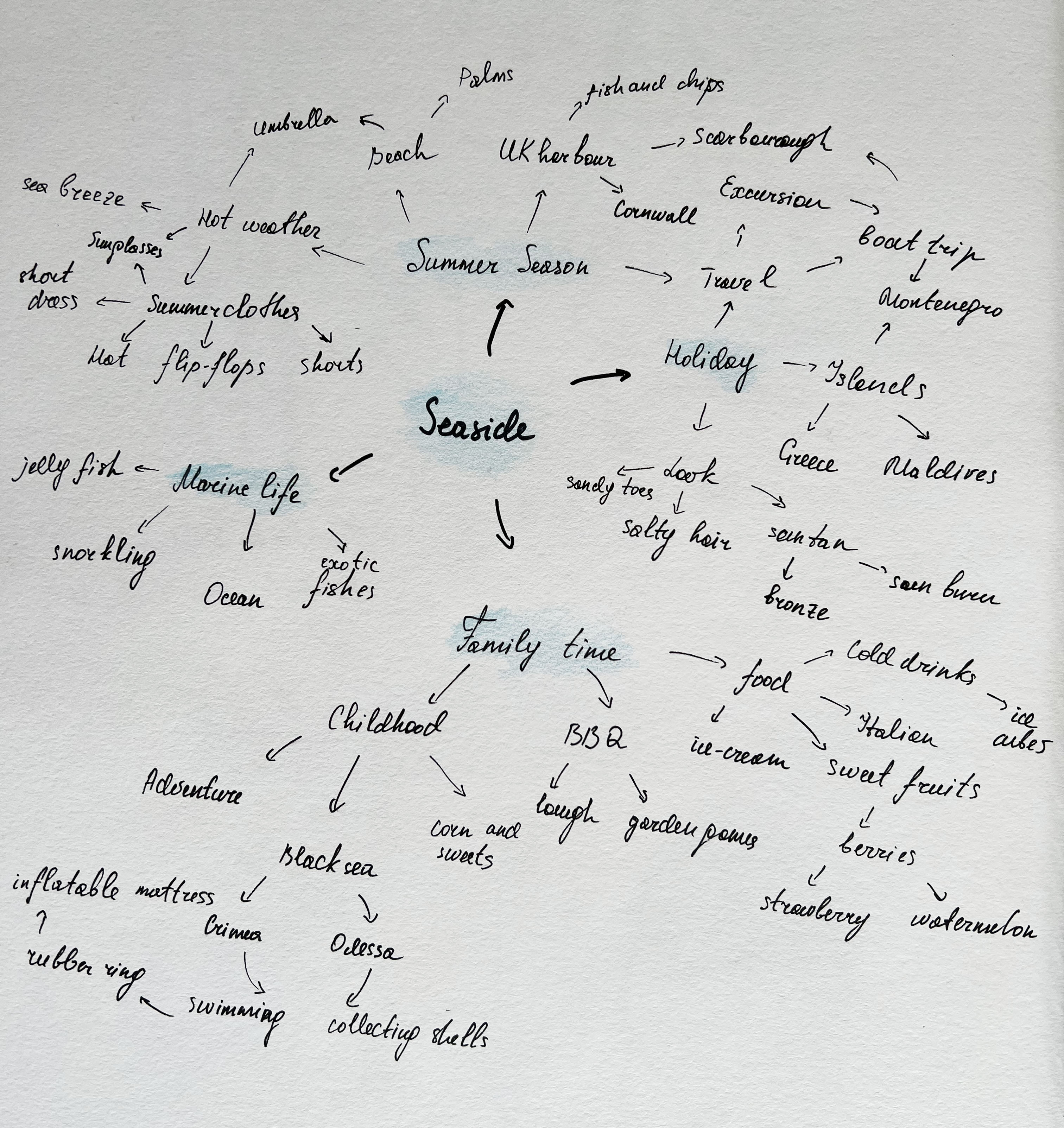 Create a spider diagram for each of these words: Seaside Childhood Angry Festival.