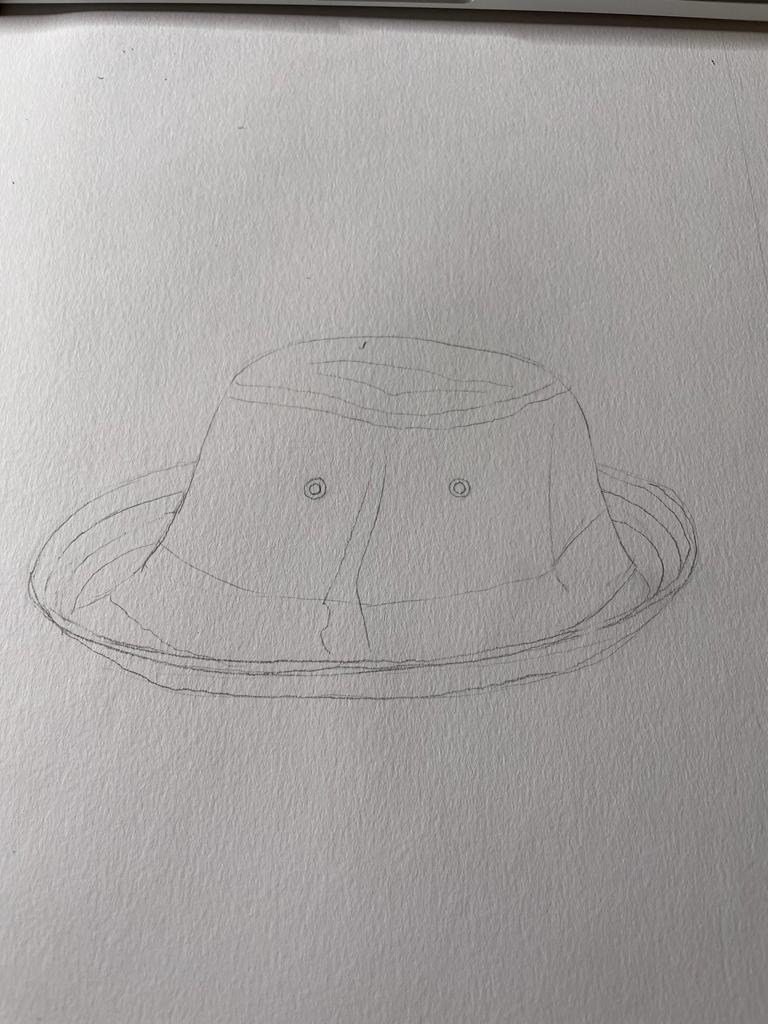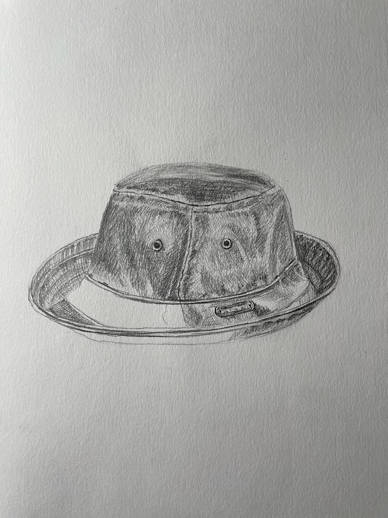 For an objective drawing from the list provided I’ve chosen my summer Michael Kors jeans hat. I took a high-resolution photograph of it to examine its texture. From that photograph, I could see that lines go from this right top corner to an angle to the bottom. Additional parts of the hat are the metal logo, and metal staples for ventilation. As jeans are hard material themselves, it has rough thick stitches on the lines where the fabric has been joined. Also, there are some cross lines, but they are more represented like dots. I’ve made a first sketch of the hat with a quick outlined drawing. After I proceeded with a pencil drawing, highlighting the details of the hat’s texture. As a result, I’ve got a quite precise and visually accurate drawing of my hat, with all fine lines and jeans texture.
