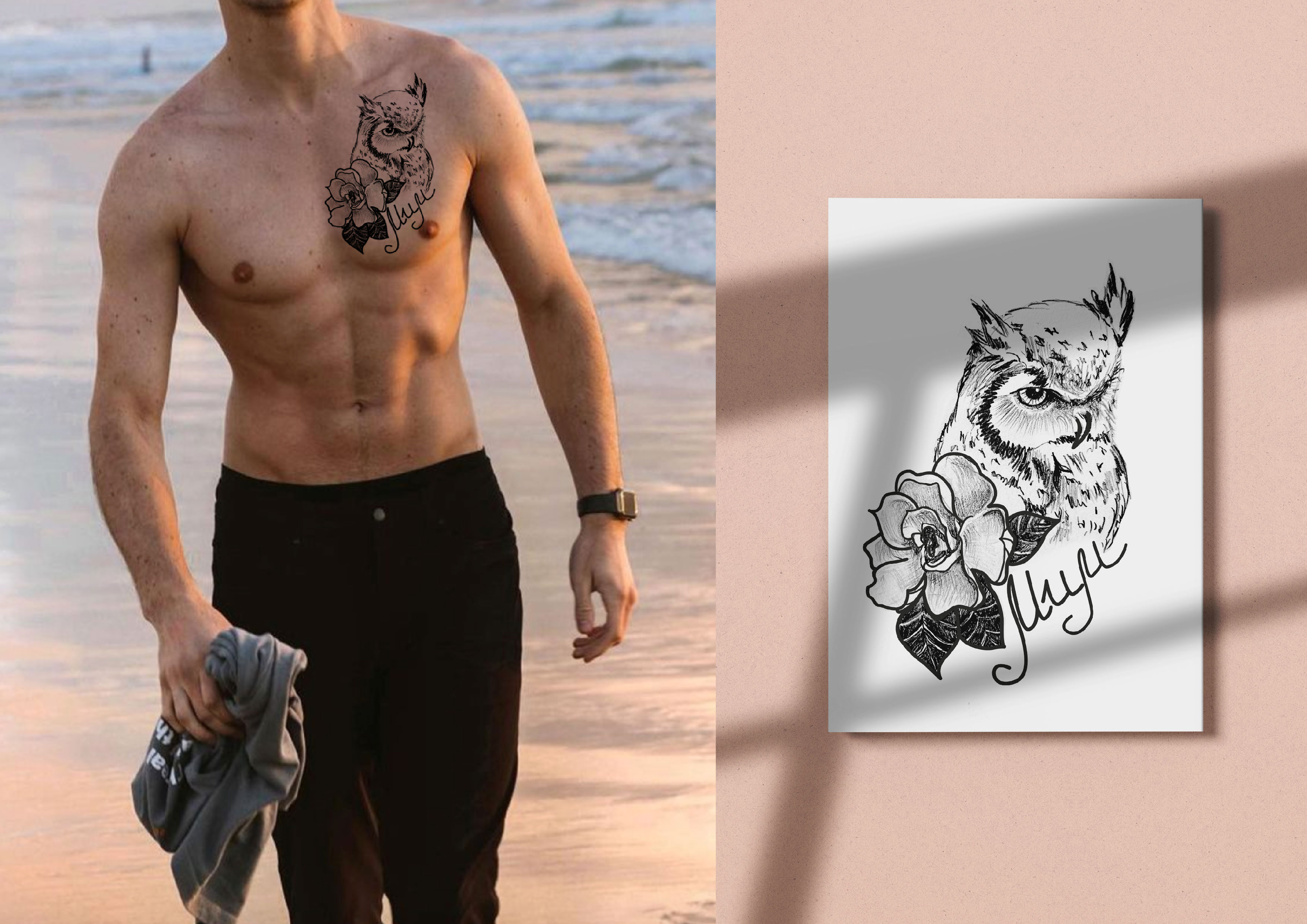 As I had this recent idea, I created some additional illustrations, trying to choose the shape of the owl I was going to use. I went for the more traditional way of owl-looking, which was not as geometric as Egyptian drawing. In the corner, I added a rose and written text with the word mum. I was going to use my own writing for the tattoo, rather than typography.