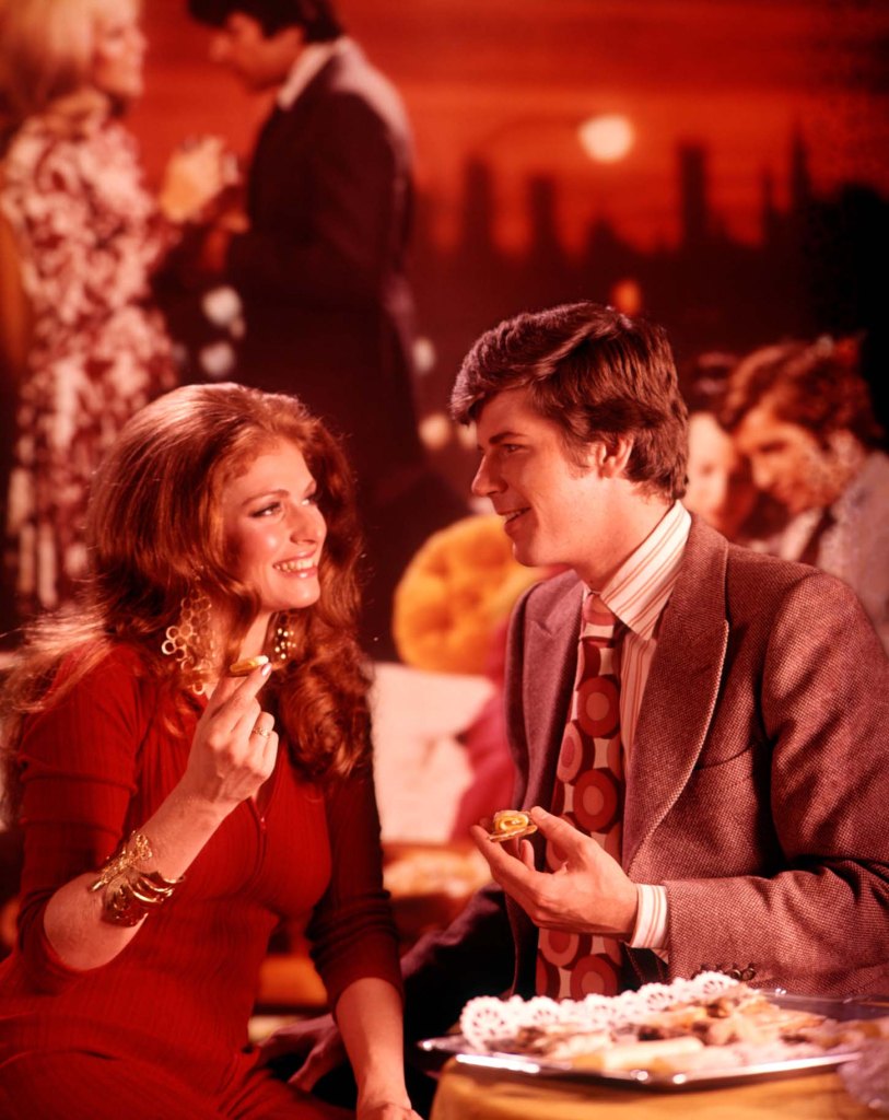 G6A74X 1970s YOUNG COUPLE MAN AND WOMAN EATING FINGER FOOD AT A PARTY