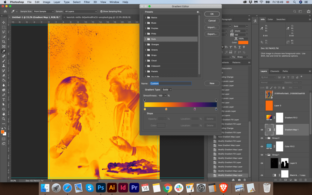 Then I started developing the design in Adobe Photoshop. First of all, I needed to process the photo in colour terms, and give it more muted tones, like sepia. The idea was that the more I dim the photo, the brighter and clearer the text information will be read from the poster. I have attached screenshots of the colour processing technique for a photographic image, with all the stages of applying filters, gradients and masks. In the process, you can see how I brought the photo from black and white photo to muted sepia. I also rendered the font, with a 3-D illusion, overlapping the font under each other.