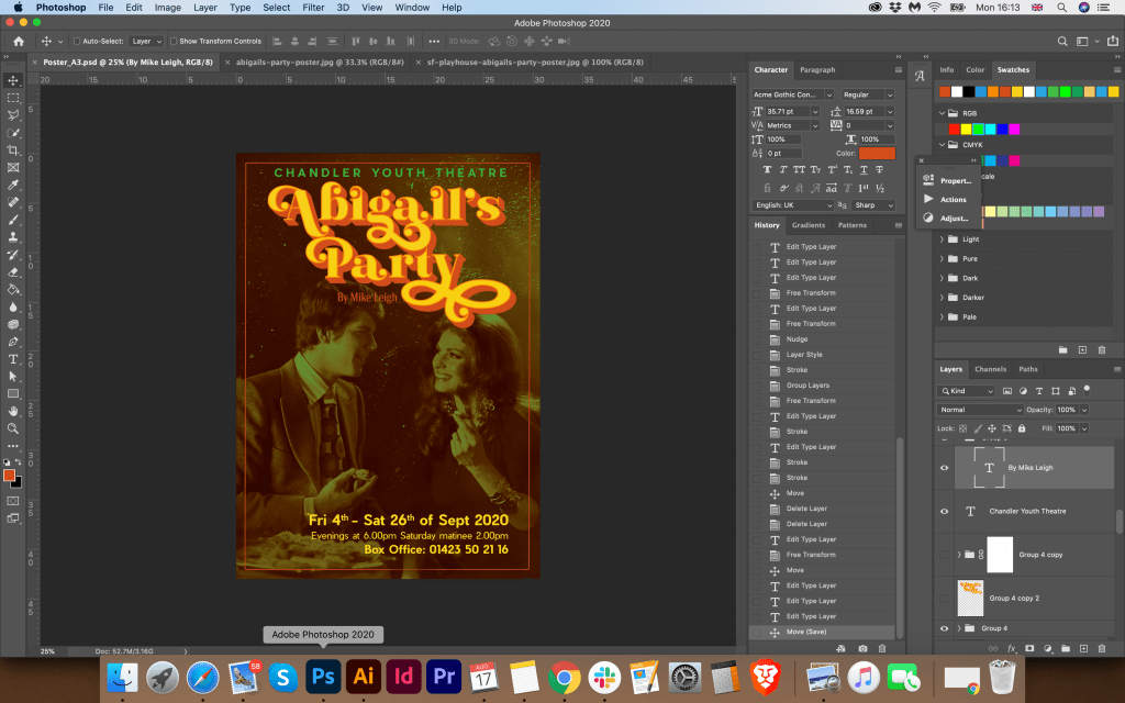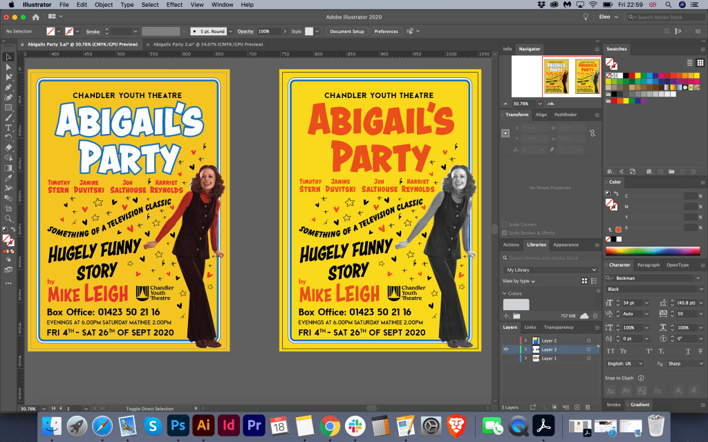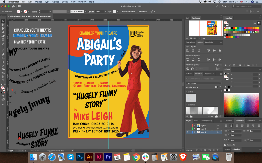 I already approximately understood how I could beat this layout. I wanted to add some movement to the design, give it dynamism, light flying objects around. My last poster for Abigail’s Party turned out to be very static, and all the attention was paid to the type and contrast photography. Here I wanted to create a bright and memorable design, apply a solid background, add slogans, some additional calls to action, in general, create a mood for attending this performance.