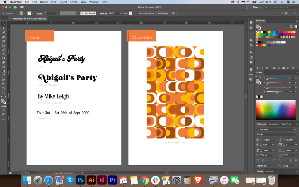 After my primary researches on the scenes, I proceed to the usual Pinterest Mood board creation. I’ve gathered all photos from the play, illustrations for the similar subject posters, also some geometrical parts from the ’70s. It helped me to pick up some inspiration and feel of the art from that decade. I really loved those warm colours that designs could bring, the dominating colour was orange, yellow and brown, with dynamic decorative fonts, in the style of disco. I tried to find some new ideas from the 1970s in general, where I found lots of psychedelic creative posters with unusual compositions and wonky fonts placed in circle composition or in angle. I’ve learnt lots of patterns that I could apply to my designs, and some cartoon style objects.