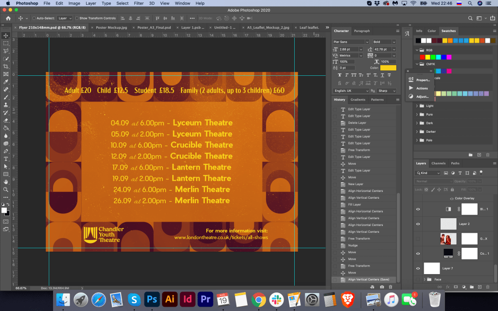 In this format, I had a bit of a challenge. I needed to create a flyer at the landscape format. So I decided to divide the space into two zones, and placed images and text like from the right and left side at the face of the flyer. I decided to add extra details for the brochure, same pattern in 70th as I designed for posters from the first part of this assignment. I used this pattern at the front and back. My tutor respond was to minimise the amount of text at the from of the flyer, so I did it. Performances schedule and prices I placed at the back of the booklet too, but this time I created a readable table for the flyer, which worked quite well in here. I was quite pleased with the result. This flyer was an excellent addition to the poster, and its design idea helped me to create a programme design as well.