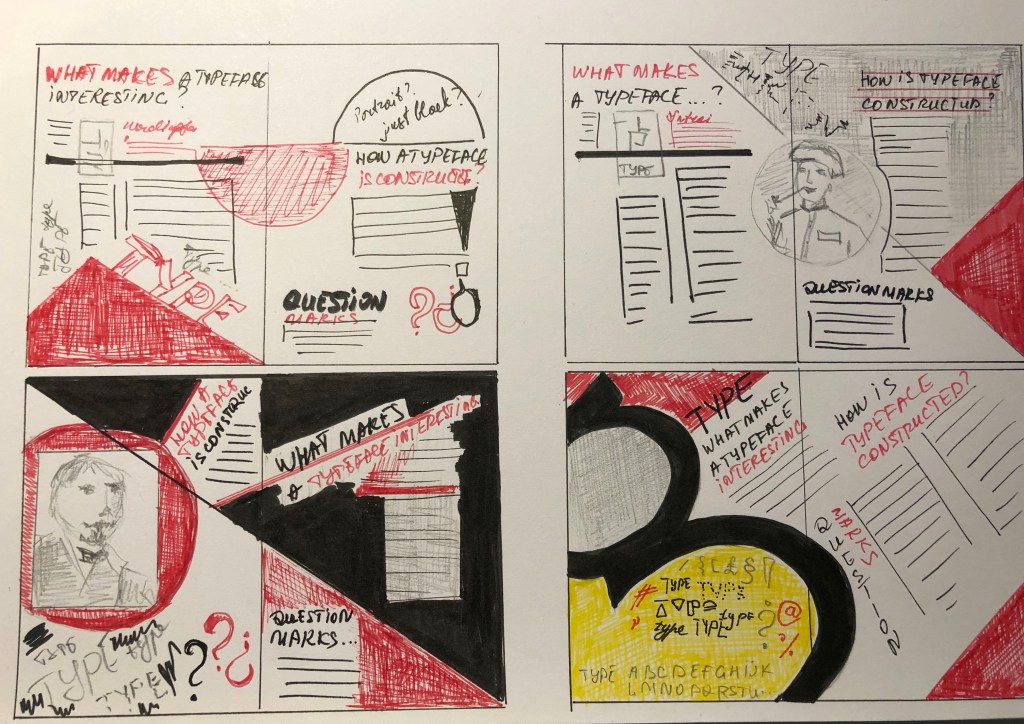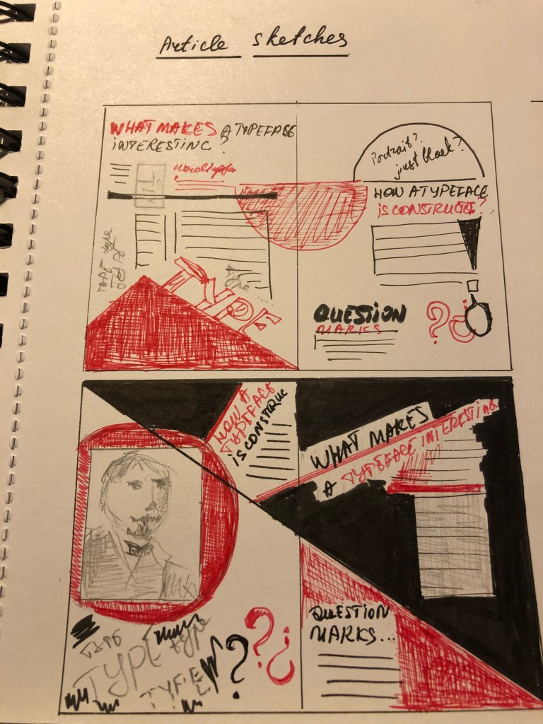 In the final part, I had to make a few sketches for the article, and understand what layout I would like to depict for my design. The main requirement was certainly to comply with the style of the cover of the magazine. Here it was already clear to me in which direction to move, I knew that I had the basic colours (black, red, white, old canvas) the geometric composition, it was only necessary to present all this correctly. I created some sketches from which I realised which layout I would like to depict.
