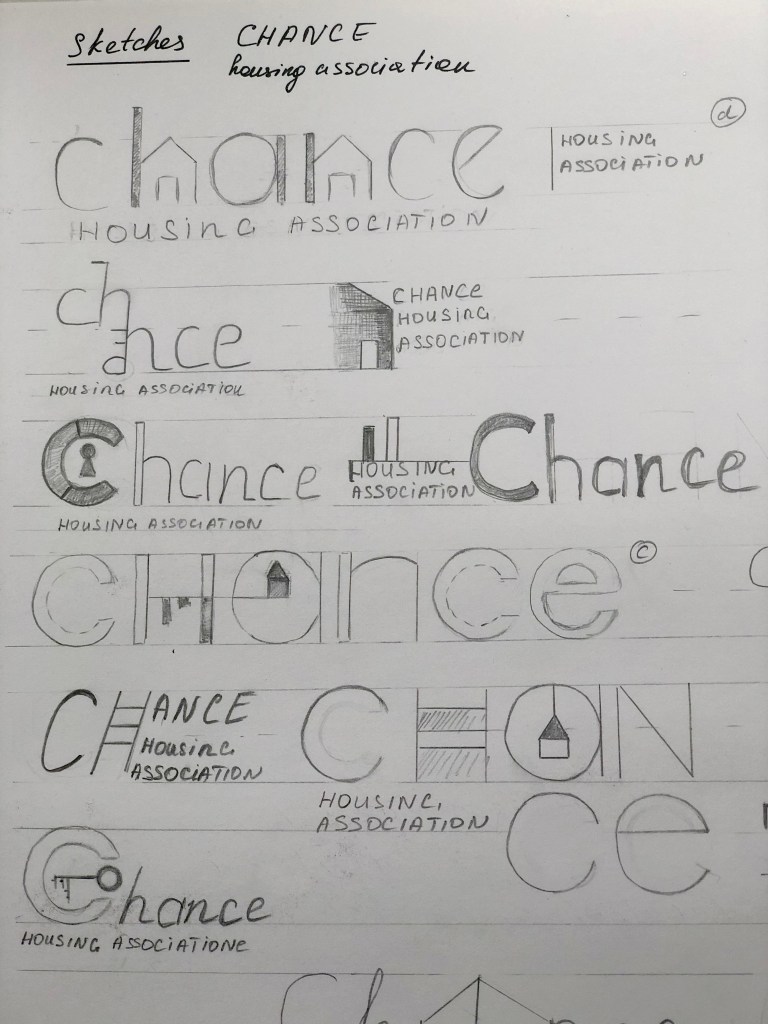 After I researched housing associations and their corporate identity, determining the fundamental differences from commercial estate agencies, critical principles in the design for such organisations on the market, I started sketching the future logo. Based on the mind map, I also summed up what keywords can be used in sketches. For the future logo in my designs, I wanted to use such objects as building, the key, lock, ladder, window, door, roof, in general, the main components of the house. My goal is to reproduce bold, readable, transparent, bright, modern logo that would attract the right audience. Since this organisation is designed for the younger generation, I also wanted to create a colour palette, with fresh, bright shades, but at the same time observe the style and fashion trends. From my sketches can be seen that some logos were based on the image of the house, roof, key, all of them were interpreted in the very spelling of the logo. I understood that initially, the task was to use the company name “Chance” as a logo, and this is a more difficult task than drawing a different logo, as a house or any other graphic element. It was essential to show that the name of the company itself is already a logo and carries its message to customers, the principle of “Type Tells Tales”.